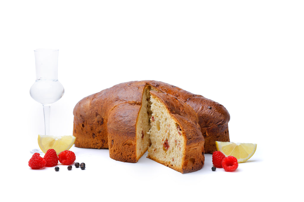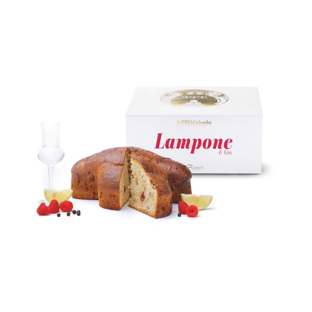 Prodotto dolciario da forno a lievitazione naturale con lamponi canditi ed imbevuto con sciroppo alcolico a base di Gin.